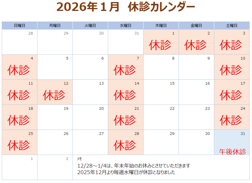 1月の休診についてはこちらのカレンダーをご確認ください。